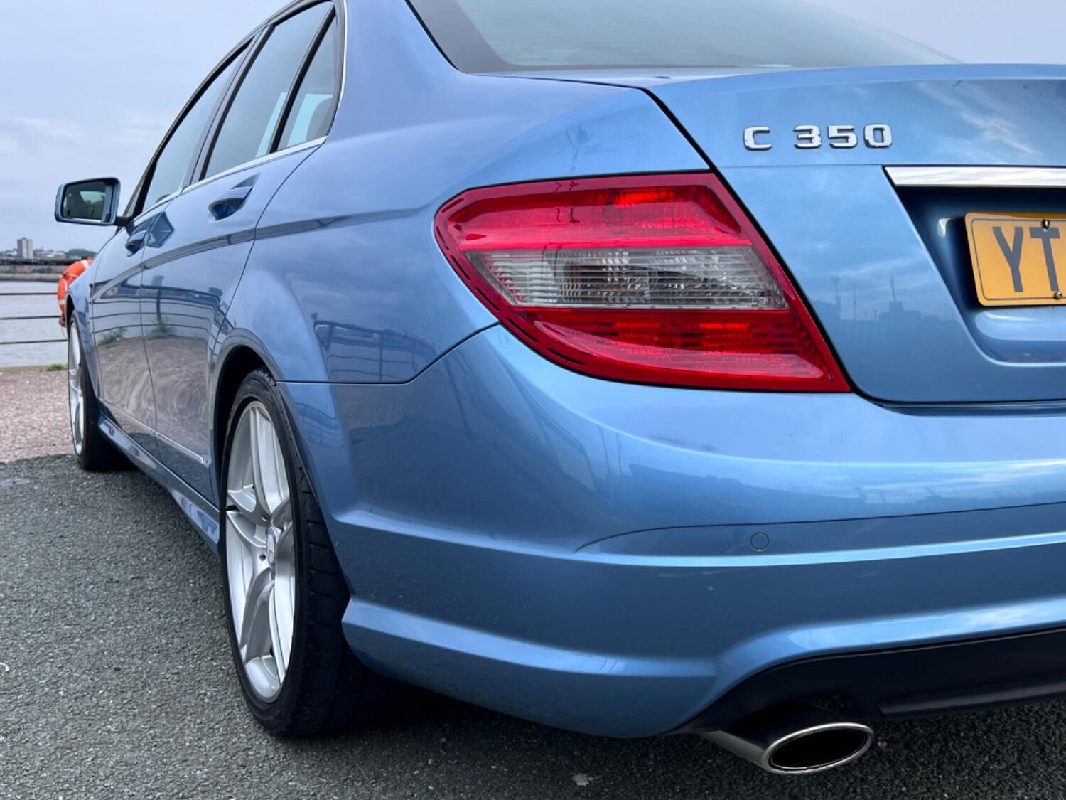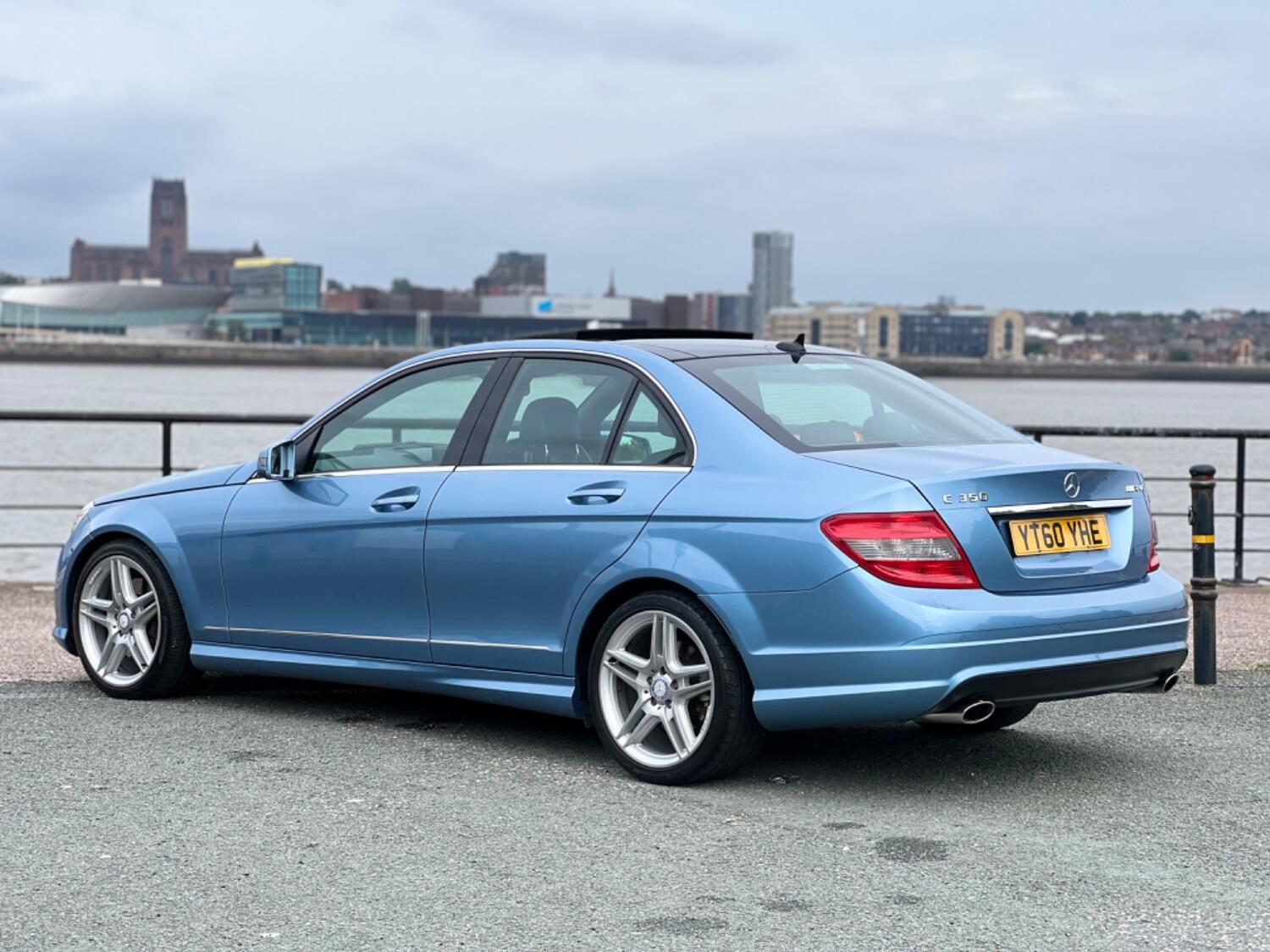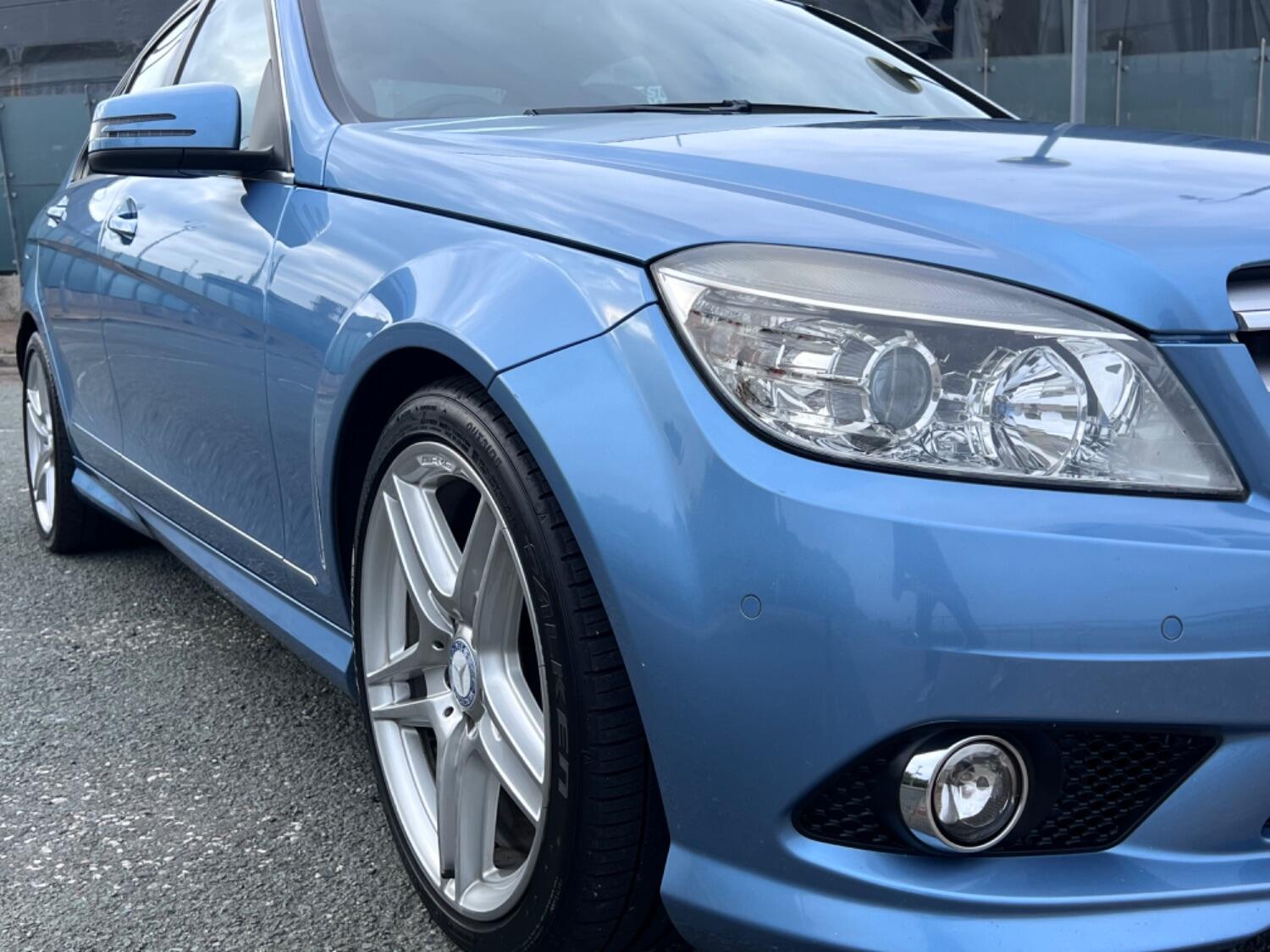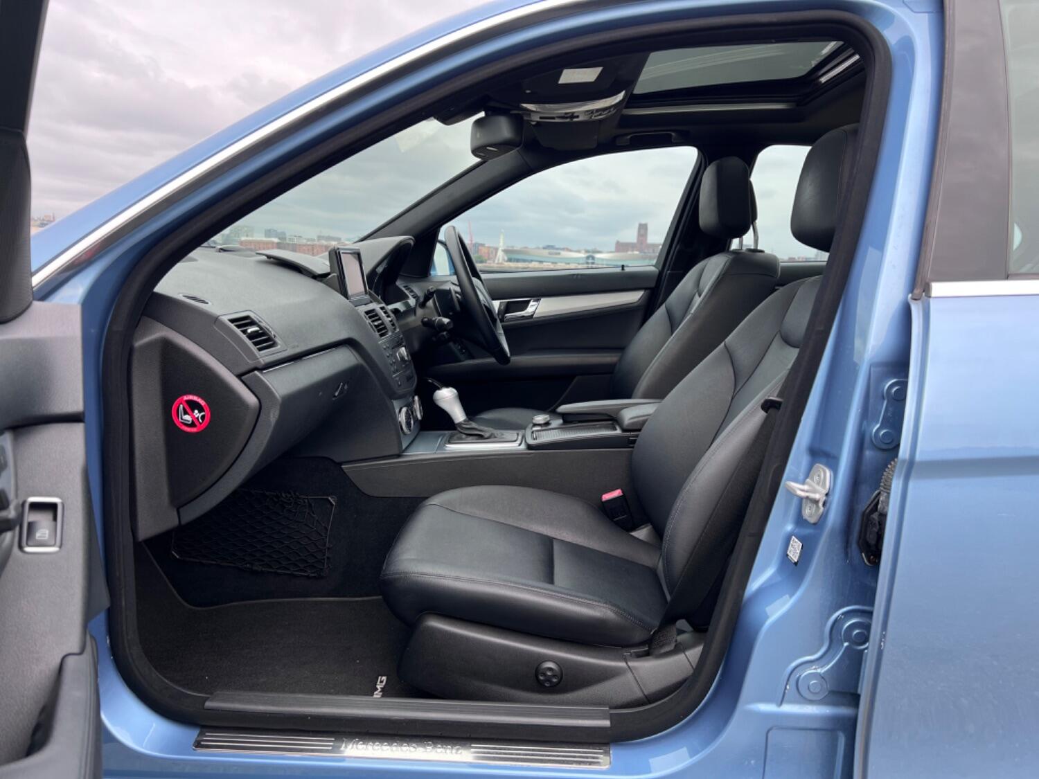 This stunning Mercedes C350 V6 petrol is finished in Indigo Lite blue metallic with black leather upholstery. A great specification from the factory with panoramic glass roof, full leather, heated seats, memory pack with electric memory front seats and steering column, satellite navigation, front and rear parking sensors, automatic lights and wipers, linguatronic, tyre pressure warning, power folding mirrors, AMG styling pack, 18" wheels, climate control, air conditioning, bluetooth phone prep and spare wheel with tools.
