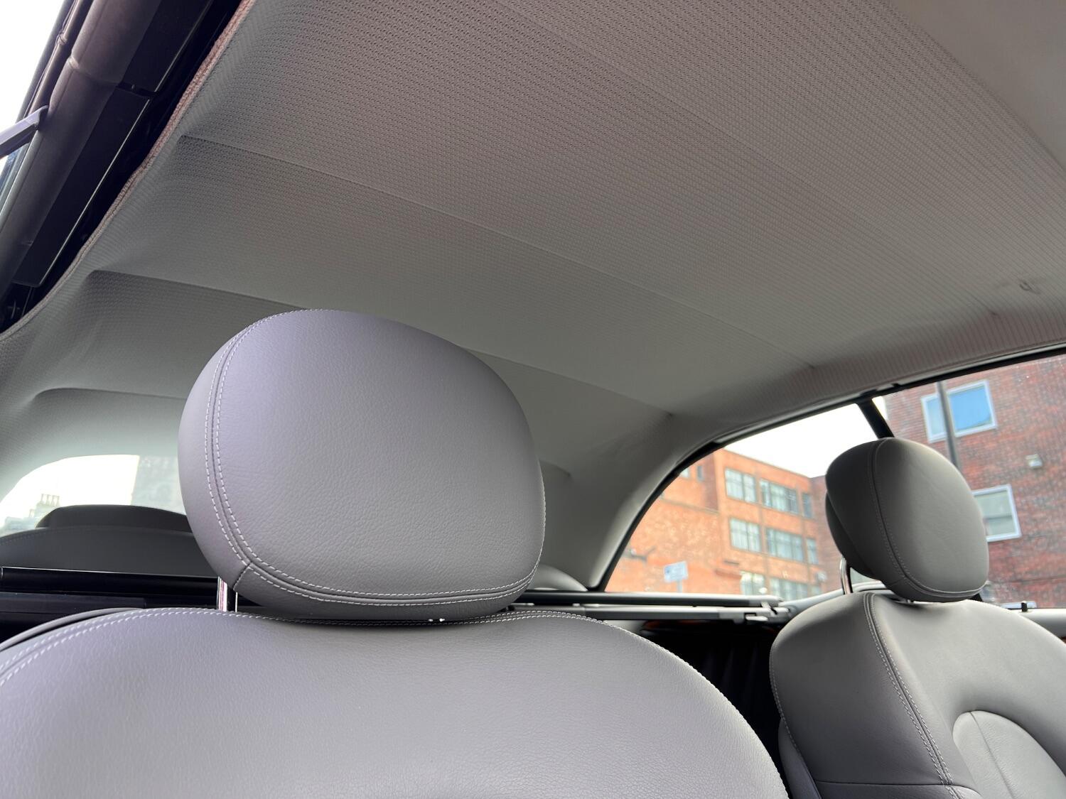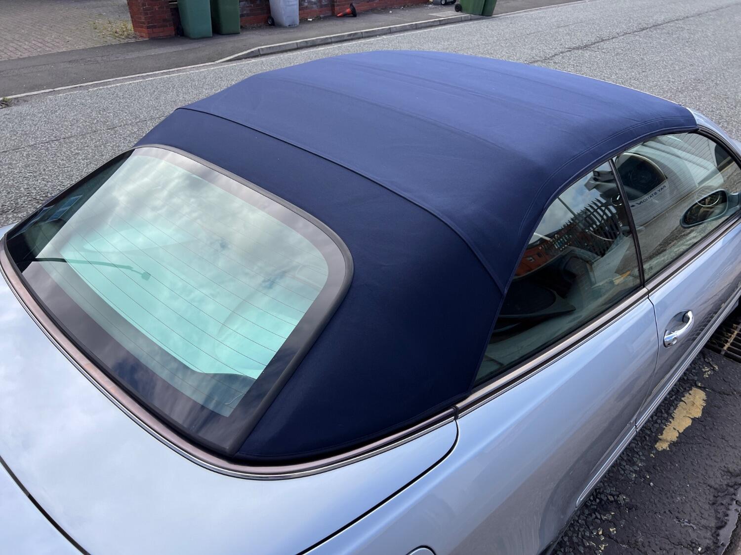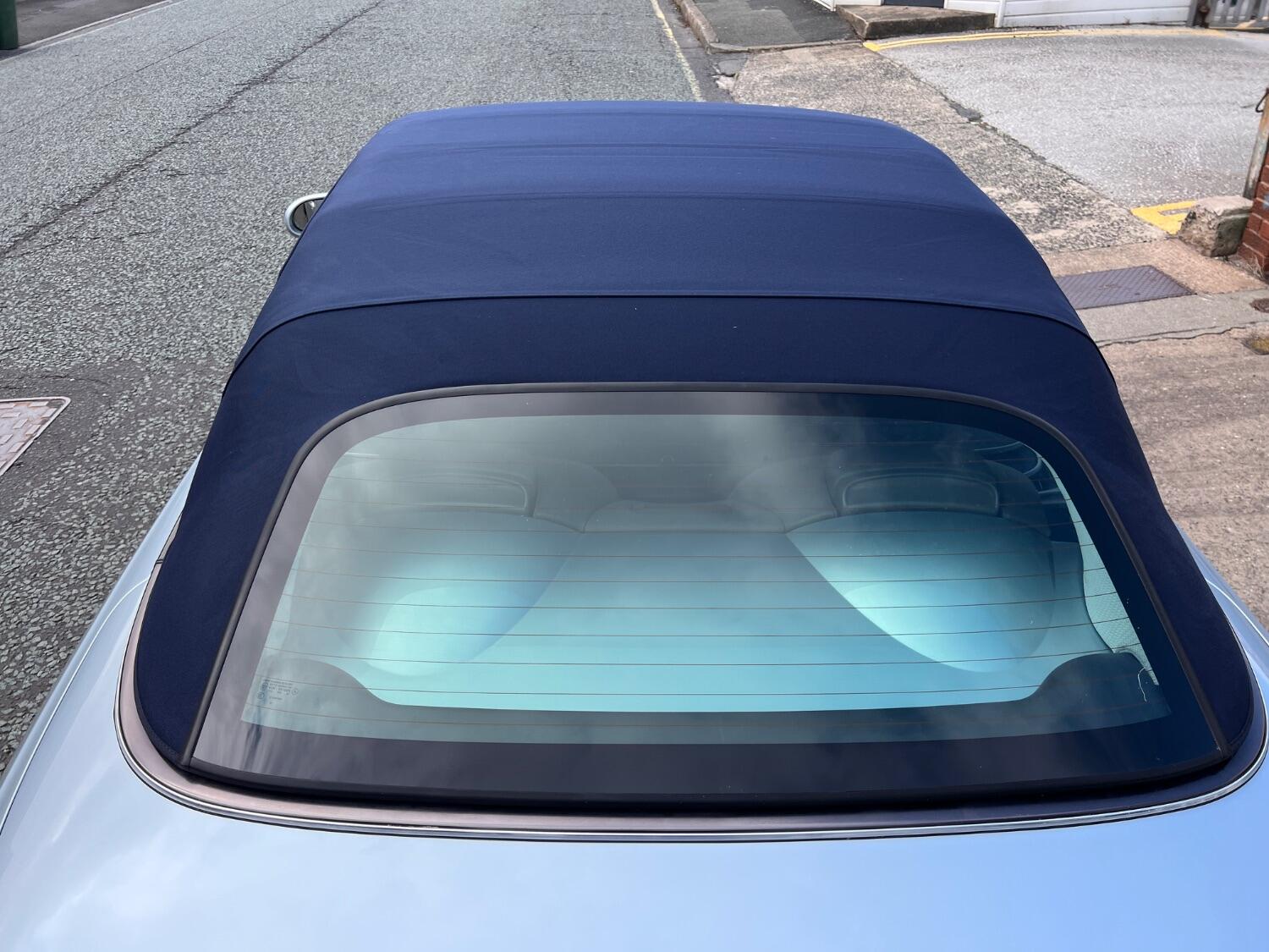 When I purchased the car the original light grey soft top was badly stained so a brand new Navy blue top was fitted. This sets the car off beautifully and complements the Telurite silver paintwork.