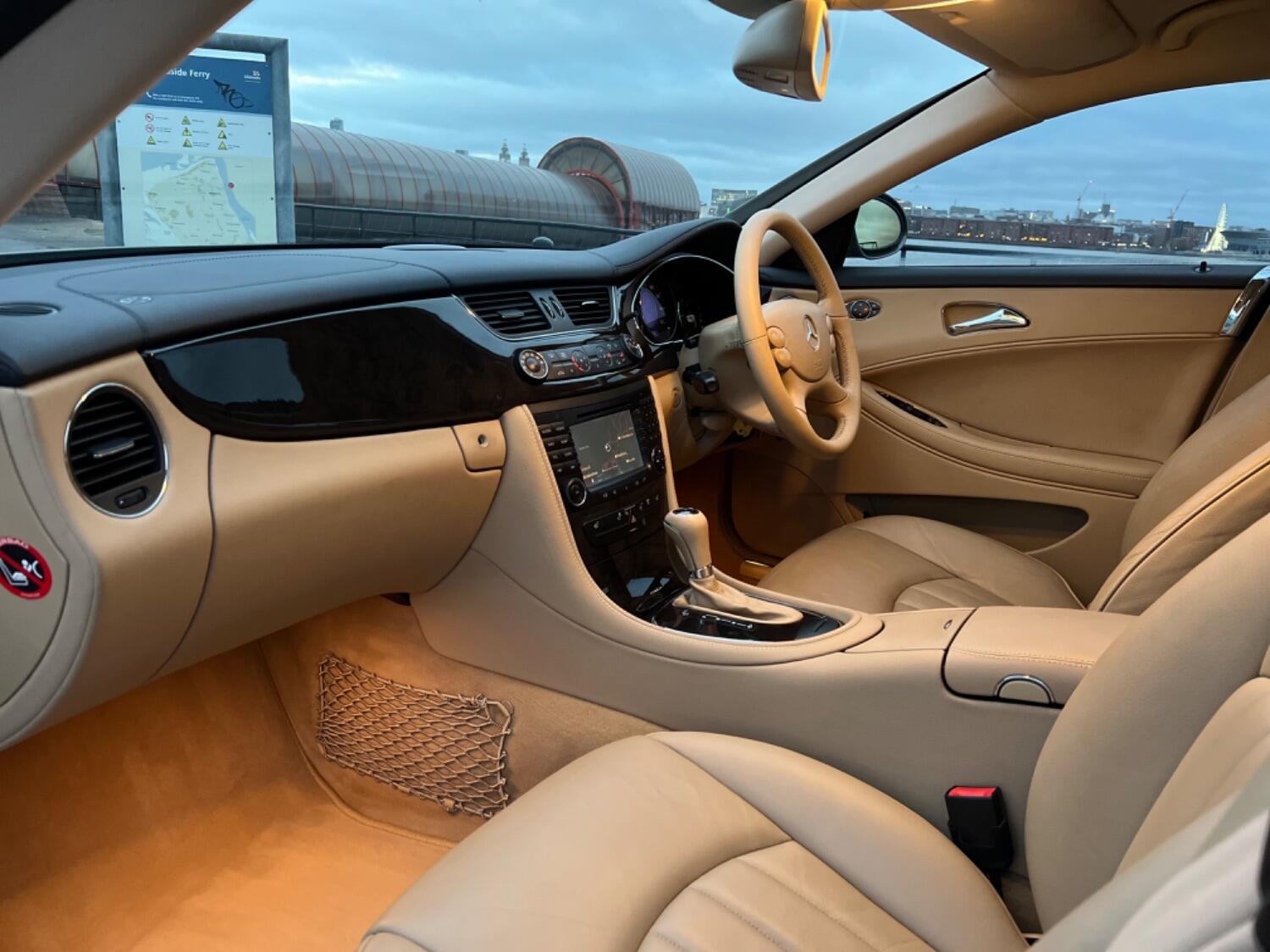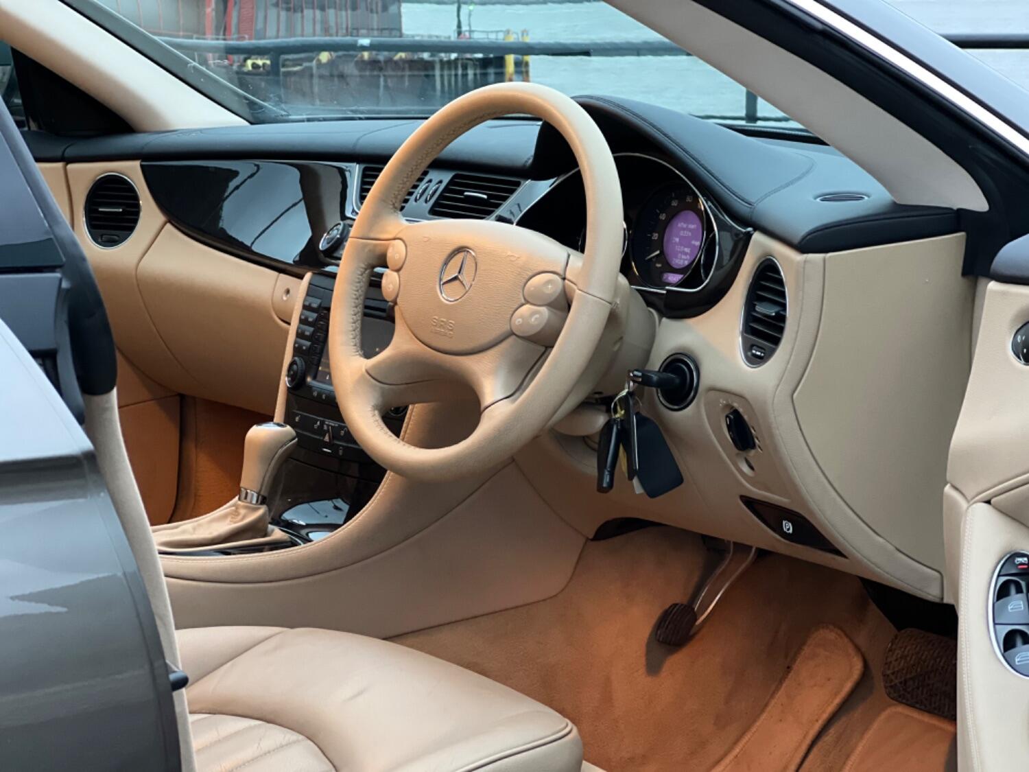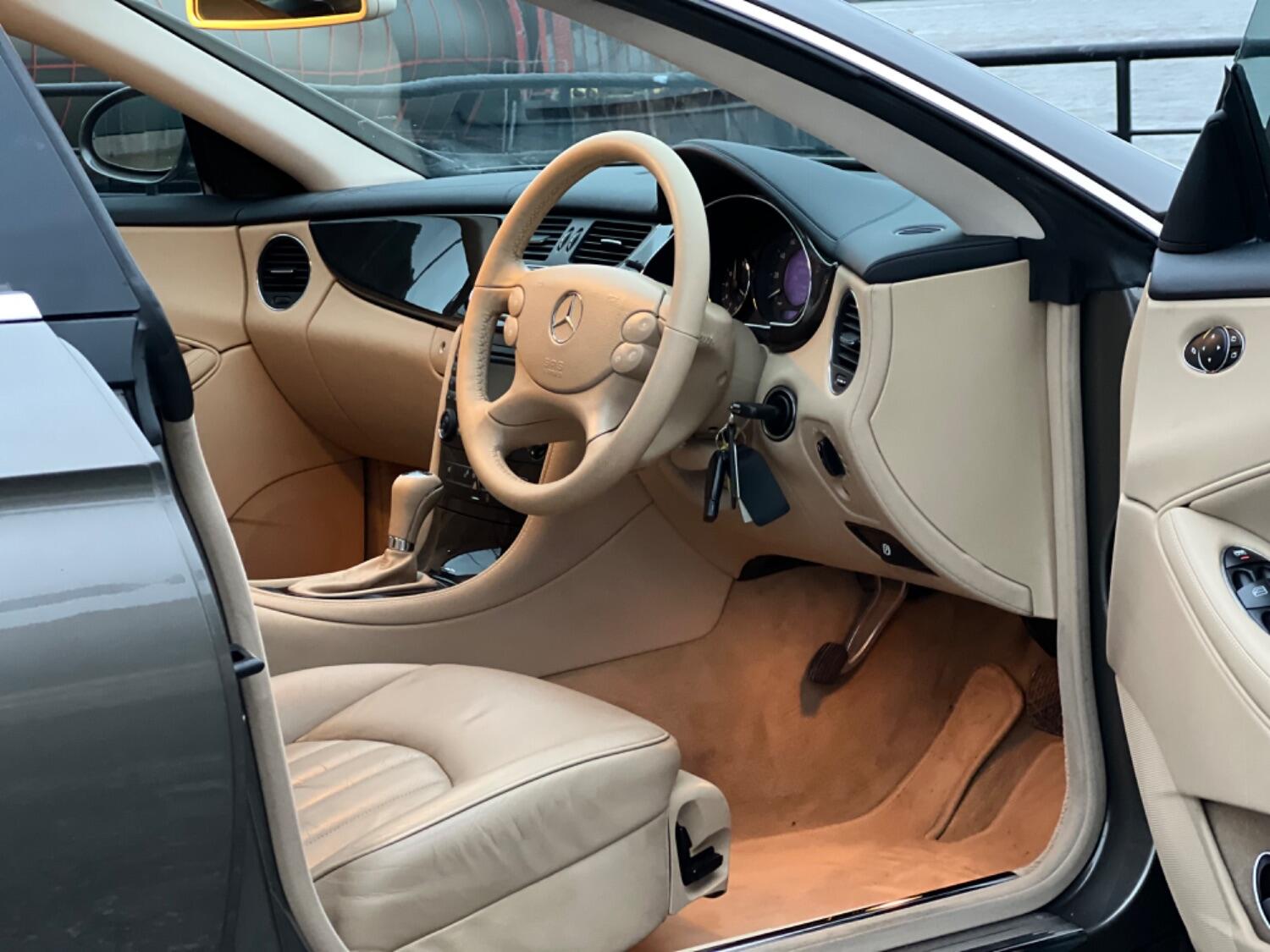 This very handsome 2005 Mercedes CLS is in beautiful condition throughout. With the super smooth 3.5 V6 engine coupled to a 7 speed automatic gearbox this is a proper luxury car. Beautiful colour combination of Indium Grey Metallic with Cashmere beige leather complemented by high gloss laurel wood. Specification includes electric seats, bi-xenon headlights, front and rear parking sensors, bluetooth phone prep, CD changer, AUX plug, heated seats, COMAND sat nav, cruise control, 18" alloy wheels, trip computer, power fold door mirrors and fitted floor mats.